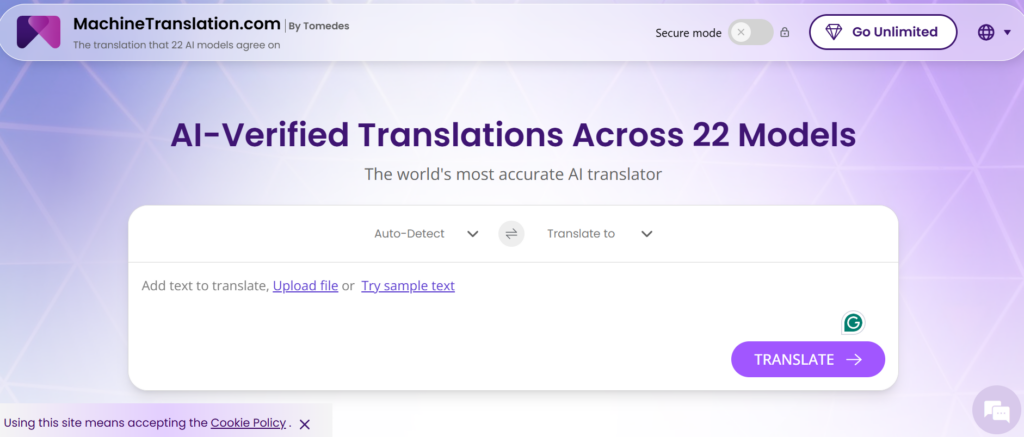 MachineTranslation.com isn’t like other translators. It doesn’t rely on a single AI engine. It checks 22 and finds the translation they all agree on. That’s confidence you can trust. Upload text, documents, even images, it keeps your formatting intact.