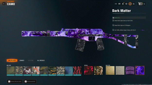 Dark Matter Camo is the ultimate flex in Call of Duty: Black Ops 6. It’s not just a skin; it’s a badge of honor. This high-tier mastery camo shows that you’ve pushed every weapon to its limit. To unlock it, you’ll need to complete every camo challenge for every gun class. It’s a serious grind—no shortcuts, no cheats—just raw skill, patience, and commitment.