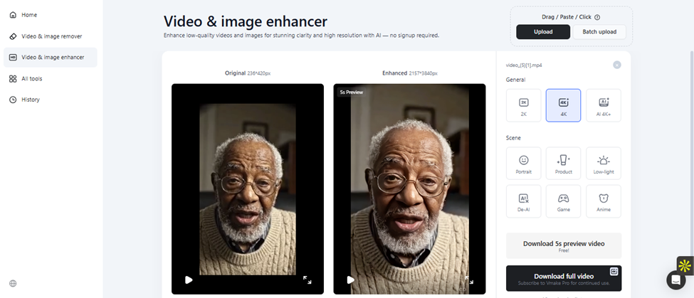 The Vmake AI video enhancer takes a different approach. It runs entirely online. And no download, installation, or setup is required to run the tool. Instead of a blanket algorithm, it offers seven distinct AI modes, each trained for various types of content.
