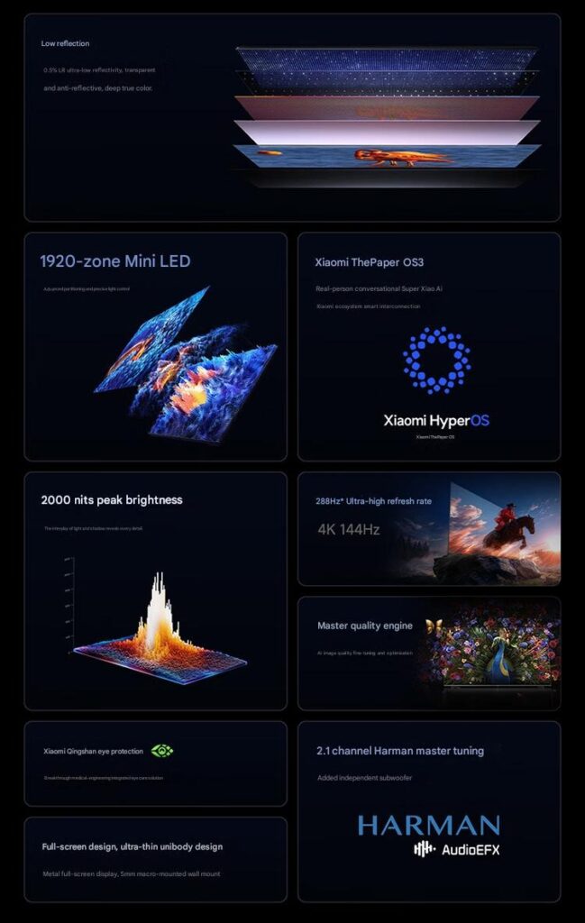 The European lineup, by contrast, feels more limited in scope. It stops at 98 inches. Its peak brightness reaches 1,200 nits. It offers up to 880 dimming zones. These figures are respectable, but they do not go as far. Xiaomi draws attention instead to what the Chinese models add. A low-reflection layer, rated at 0.5%, aims to reduce glare. This should make viewing easier in bright rooms, where reflections often spoil the picture.